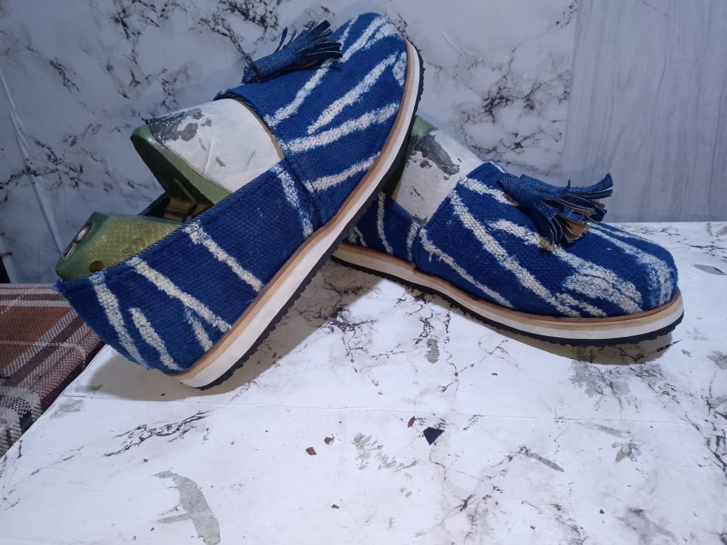 "Batik Spirit" Handcrafted Moccasins – Indigo Fabric & Signature Tassel
