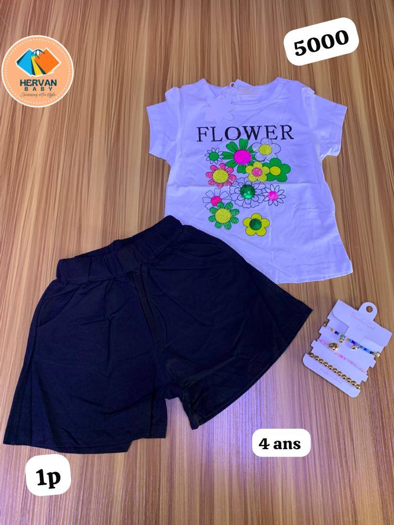 "A practical and stylish set for everyday wear. The white T-shirt features a colorful ""FLOWER"" graphic with sparkling details, adding a cheerful touch. It is paired with simple and comfortable navy blue shorts, perfect for any occasion.
